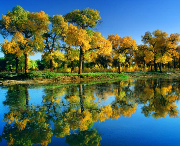 额济纳绿洲,又称居延绿洲,这里的胡杨林是当今世界上仅存的三大原始胡杨林之一。胡杨树挺拔高大,苍劲古朴,素有“生而不死一千年,死而不倒一千年,倒而不朽一千年”之美誉,被视为植物的活化石,系国家二级保护树种。 每当深秋季节,胡杨树叶变得一片金黄,形成胡杨秋色,树影婆娑,金韵斑斓,奇妙绝伦,赏心悦目。漫步在浓郁的胡杨林中仿佛进入神话般的仙境。茂密的胡杨千奇百怪,神态万般。粗壮的几人难以合抱,挺拔的七、八丈之高,怪异的似苍龙腾越,虬蟠狂舞,令人惊奇不已,叹为观止。仅就密密匝匝的树叶,也是风采独有。幼小的胡杨,叶片狭长而细小,宛若少女妩媚的柳眉,人们常常把它误认为柳树;壮龄的胡杨,叶片又变成卵形、阔卵形或三角形,犹如兴安岭的白桦;进入老年期的胡杨,叶片才定型为椭圆形。更令人称奇者,在同一棵胡杨树冠的上下层次,还长着不同形状的叶片,因此,又称“异叶杨”。